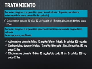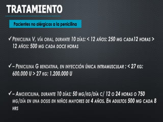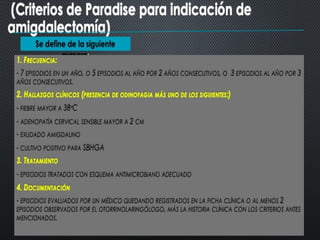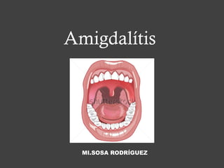 La amigdalitis es una inflamación de las amígdalas causada por infecciones virales o bacterianas, comúnmente asociada a síntomas como dolor faríngeo, fiebre y dificultad para tragar. Puede clasificarse en aguda, crónica y recurrente, y sus agentes causales incluyen estreptococos y virus como Epstein-Barr. El tratamiento varía desde antibióticos hasta cirugía (amigdalectomía) dependiendo de la gravedad y frecuencia de los episodios.