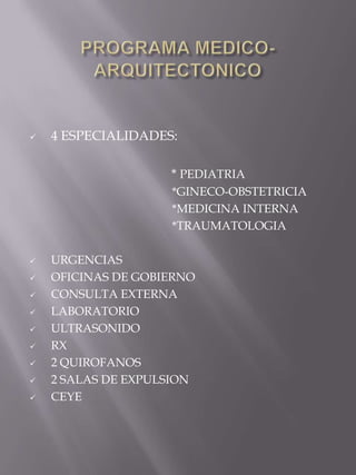 Este documento describe los planes para remodelar y ampliar el Hospital Regional de Huichapan. La remodelación incluirá la adición de 4 especialidades médicas, áreas de urgencias, oficinas de gobierno, consultas externas, laboratorio, rayos X, quirófanos, salas de parto, hospitalización para adultos y niños, cafetería, rehabilitación, comedor, áreas de enseñanza y un estacionamiento subterráneo. Se construirán estructuras adicionales sobre los edificios existentes y se demolerá y reconstru
