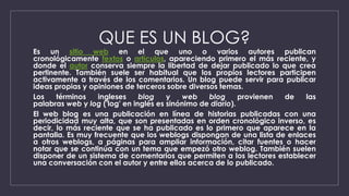 Este documento define qué es un blog y para qué sirve. Explica que un blog es un sitio web en el que los autores publican artículos de forma cronológica. Los lectores pueden comentar y participar. Un blog permite expresar ideas y opiniones sobre diversos temas. Sirve para mejorar la expresión escrita, alimentar la imaginación, reflexionar sobre experiencias y, en algunos casos, generar ingresos. Crear un blog también puede contribuir a la nota final del curso de filosofía.
