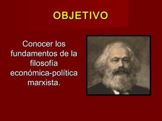 Este documento resume la vida y pensamiento de Karl Marx. Detalla su biografía, incluyendo su nacimiento en 1818 en Alemania, sus estudios de derecho y filosofía, y su trabajo como periodista y editor. También describe sus principales obras como El Manifiesto Comunista y El Capital, en las que desarrolla conceptos como la lucha de clases, la plusvalía, la teoría del valor-trabajo y el materialismo histórico. Finalmente, resume algunos de sus aportes clave a la filosofía, economía, sociolog