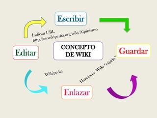 El documento habla sobre los wikis y su historia, funcionalidad, metáfora y usos educativos. Brevemente resume que los wikis permiten la edición colaborativa de páginas web de forma rápida y que el primer wiki fue creado en 1995. También menciona algunos usos educativos como la recopilación de contenidos y actividades de aula de forma colaborativa.