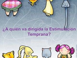Este documento trata sobre la estimulación temprana de los niños. Explica que la estimulación temprana es un proceso natural mediante el cual la madre estimula diferentes áreas del desarrollo del niño a través de actividades y juegos, lo que le permite al niño ejercer mayor control sobre el mundo. También describe que la estimulación temprana es una disciplina terapéutica que asiste a bebés en riesgo para ayudarlos a desarrollarse de manera psicofísica e intelectual de forma saludable. Finalmente,