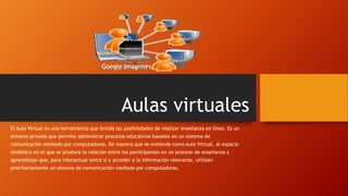 El documento describe las secciones y herramientas de un aula virtual, incluyendo las responsabilidades de los alumnos y tutores. Las secciones del aula virtual incluyen enseñanza, aprendizaje, programas y cronogramas. Los tutores gestionan el aula virtual y asisten a los alumnos, mientras que los alumnos participan activamente y cumplen con las fechas límite.