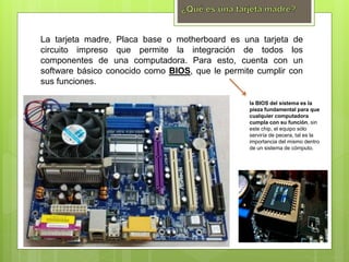 La tarjeta madre sirve como medio de conexión entre los principales componentes de una computadora como el microprocesador, la memoria RAM y las tarjetas de expansión. Incluye un chip BIOS que almacena la configuración básica del sistema y es necesario para el funcionamiento de la computadora. Las tarjetas madres vienen en diferentes formatos y cuentan con conectores que permiten la integración de periféricos.