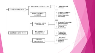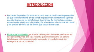 El documento describe los conceptos básicos de los costos de producción. Explica que los costos de producción incluyen materiales directos e indirectos, mano de obra directa e indirecta y otros costos indirectos. También analiza la importancia de los costos de producción para la toma de decisiones empresariales y la determinación de precios.