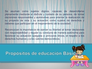 Este documento presenta las orientaciones para la asignatura de Formación Cívica y Ética en la educación básica en México. Propone que los estudiantes sean sujetos dignos y capaces de tomar decisiones responsables y desarrollar plenamente su potencial a través del cuidado de sí mismos y el respeto a los derechos humanos. También enfatiza la importancia del diálogo, la empatía y la reflexión crítica para promover la autonomía del estudiante y su participación cívica.