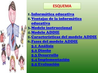 El documento describe el modelo ADDIE para el desarrollo de aplicaciones de informática educativa. El modelo ADDIE consta de 5 fases secuenciales: 1) Análisis, 2) Diseño, 3) Desarrollo, 4) Implementación y 5) Evaluación. Cada fase produce insumos para la siguiente y juntas guían el proceso de crear materiales educativos efectivos con tecnología.