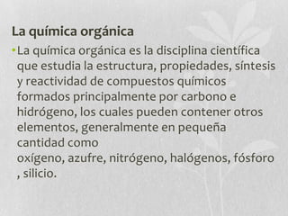 La química orgánica estudia la estructura, propiedades, síntesis y reactividad de compuestos formados principalmente por carbono e hidrógeno. Estos compuestos se caracterizan por formar enlaces covalentes, tener puntos de fusión y ebullición bajos, ser combustibles, y estar constituidos por pocos elementos como carbono, hidrógeno, oxígeno, nitrógeno y halógenos. La química orgánica busca determinar la estructura molecular y cómo se enlazan los átomos en los comp