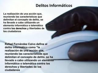 Este documento presenta un resumen de la Ley de Delitos Informáticos de Venezuela. Explica que la ley tiene como objetivo proteger los sistemas que utilizan tecnologías de información y prevenir delitos cometidos mediante estas tecnologías. Describe los cinco tipos principales de delitos cubiertos por la ley: 1) contra sistemas informáticos, 2) contra la propiedad, 3) contra la privacidad, 4) contra niños y adolescentes, y 5) contra el orden económico. Además, indica que la ley fue c