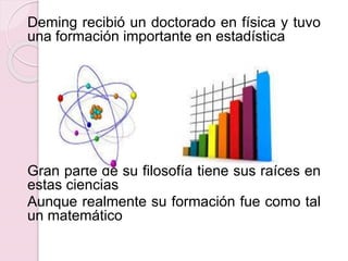 W. Edwards Deming fue un físico y estadístico estadounidense que trabajó en el control de calidad en las décadas de 1920 y 1930. Enseñó estadística de calidad a los japoneses después de la Segunda Guerra Mundial, lo que ayudó a revitalizar su industria. Deming desarrolló 14 principios de gestión de la calidad basados en la filosofía de mejora continua, liderazgo, trabajo en equipo y orientación al cliente. Su enfoque de la calidad tuvo una gran influencia en