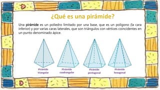 Una pirámide es un poliedro delimitado por una base poligonal y caras triangulares que convergen en un vértice. Existen varios tipos de pirámides definidos por la forma de su base y caras, como pirámides rectas, oblicuas, regulares, convexas y cóncavas. El cálculo del área y volumen de una pirámide depende de si es regular o irregular.
