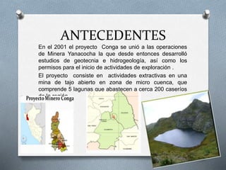 El proyecto Conga, desarrollado por minera Yanacocha en Cajamarca, Perú, ha generado conflictos sociales significativos debido a preocupaciones sobre la escasez de agua y la contaminación ambiental. A pesar de las proyecciones económicas y de su inversión prevista de $5,500 millones, la comunidad local ha expresado desconfianza hacia los compromisos de la empresa, citando la falta de beneficios y los impactos negativos en los ecosistemas. Los estudios de impacto ambiental han sido cuestionados por no evaluar adecuadamente los riesgos para los humedales y la biodiversidad, generando un fuerte rechazo entre la población.