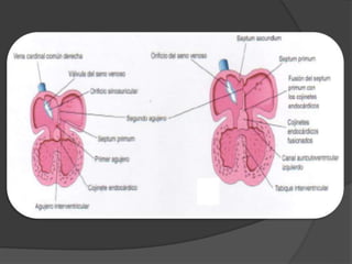 El documento describe las etapas tempranas del desarrollo del corazón, incluida la formación de los arcos aórticos, las ramificaciones de la arteria dorsal, y la circulación a través del corazón primitivo. Luego detalla la división de la aurícula y ventrículo primitivos, la formación del tabique auricular y ventricular, y el desarrollo de las válvulas cardíacas y conductos arteriales. El documento provee información sobre la anatomía y fisiología temprana del corazón en desarrollo.