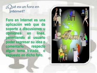 El documento describe las características principales de los foros en Internet, incluyendo que son aplicaciones web que permiten discusiones y opiniones en línea sobre un tema particular, que pueden ser públicos o privados, y que generalmente tienen diferentes niveles de acceso de lectura y publicación. También describe los principales soportes de software para crear foros y los principales problemas que un moderador debe controlar como spam, trolls y leechers.