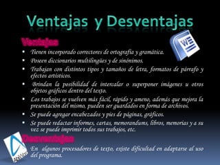 Este documento describe los procesadores de texto, que son software diseñado para crear documentos de texto. Explica que los procesadores de texto permiten formatos de párrafos, estilos, imágenes y más. También detalla algunas características comunes como cortar y pegar texto, alinear párrafos, e incluir correctores ortográficos. Finalmente, menciona algunos ejemplos populares de procesadores de texto como Microsoft Word, WordPad y Notepad.