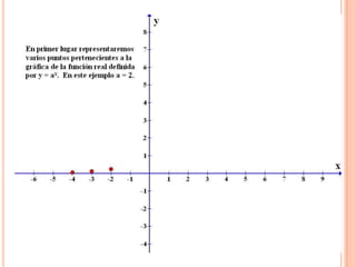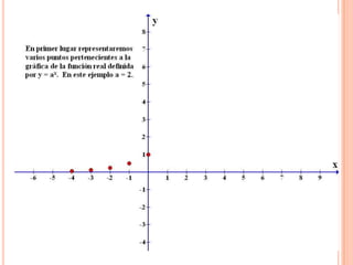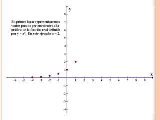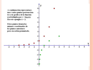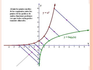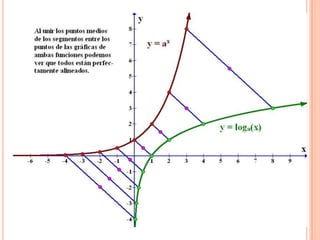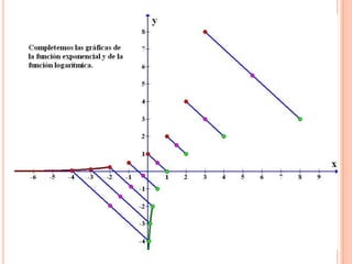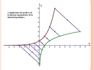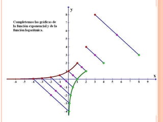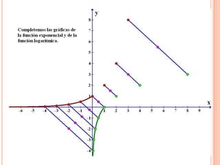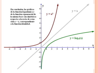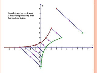 Este documento describe las funciones exponenciales y logarítmicas. Explica cómo graficar funciones exponenciales de la forma f(x)=ax con a>1 y 0<a<1, así como funciones logarítmicas de la forma f(x)=loga(x) con a>1 y 0<a<1. También presenta ejemplos de aplicaciones de estas funciones para modelar crecimiento poblacional.