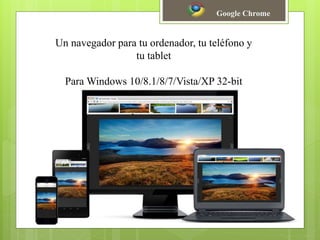 Este documento presenta información sobre el navegador web Google Chrome. Explica que Chrome se basa en código abierto y utiliza el motor Webkit, y funciona en Windows, Mac y Linux. También describe algunas características clave de Chrome como su rápido motor JavaScript V8, su capacidad de ejecutar pestañas en procesos separados para mejorar el rendimiento, y su interfaz simplificada con pestañas en la parte superior.
