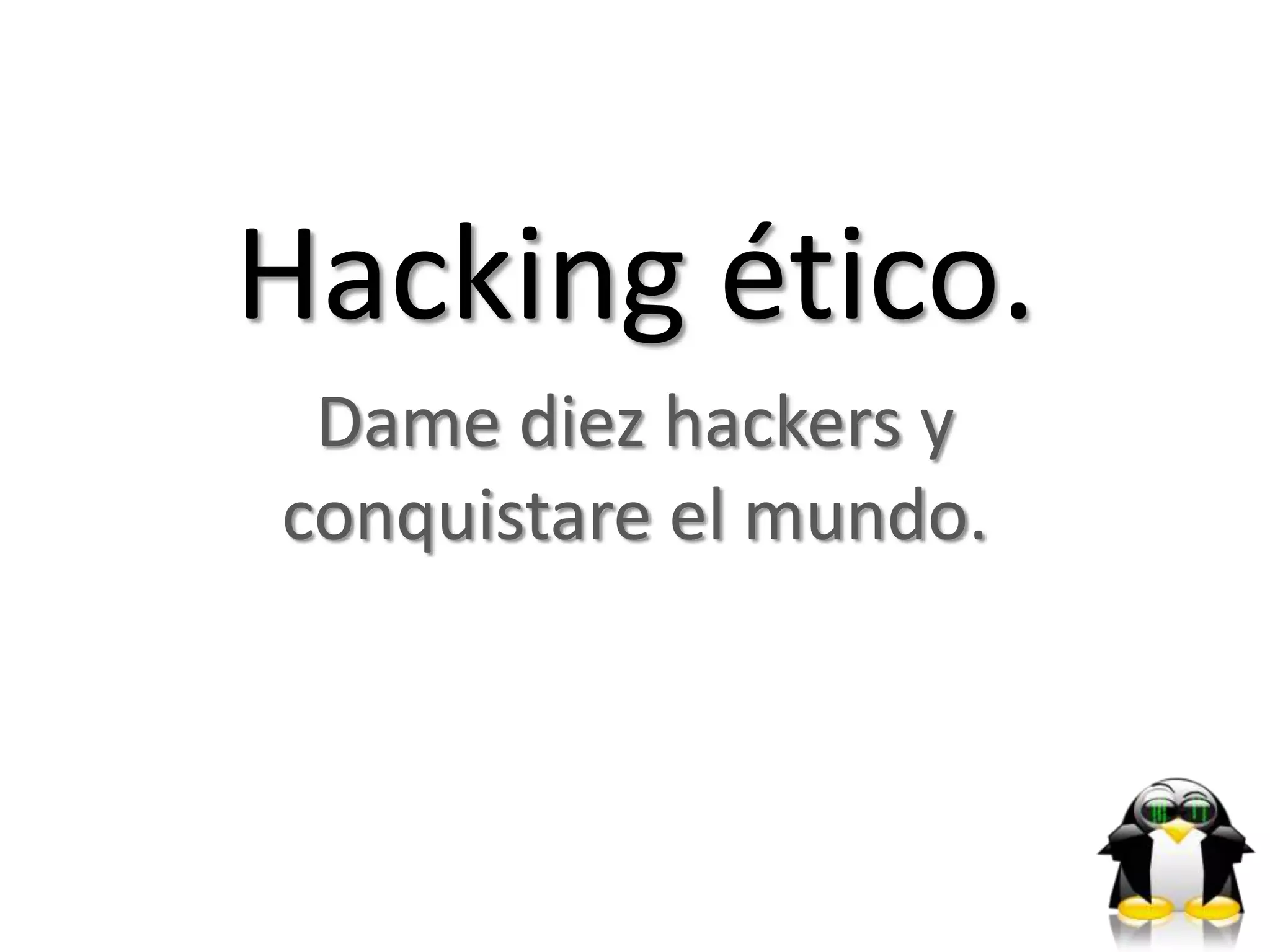 Este documento presenta una charla sobre hacking ético. Proporciona la biografía del orador Vicente Lingan, quien tiene 15 años de experiencia en seguridad informática ofensiva. La agenda incluye una historia del hacking, hacking ético, rompiendo paradigmas, hackeando al humano usando Backtrack y preguntas. Explica conceptos como footprinting, scanning, Metasploit Framework y OpenVAS. También cubre tipos de hackeos éticos como redes remotas, war dialing, redes locales y social engineering.