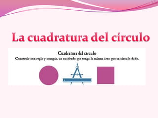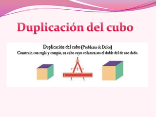 Este documento trata sobre el origen del problema de duplicar el volumen de un cubo. Explica que en la antigua Atenas, los ciudadanos debían construir un altar con el doble del volumen del existente para detener una plaga. Luego, describe cómo usar la proporcionalidad de Hipócrates para encontrar la longitud de la arista de un cubo que duplique el volumen de otro cubo dado. Finalmente, menciona brevemente que Hipócrates logró cuadrar una figura con lados curvos llamada lúnula.