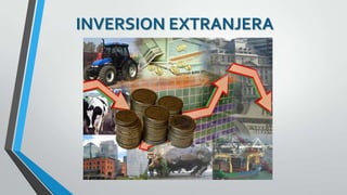El documento habla sobre la inversión extranjera en México. Define la inversión extranjera como la colocación de capitales a largo plazo en otro país con el propósito de crear empresas y servicios para internacionalizarse. Muchos gobiernos ofrecen incentivos como exenciones tributarias para atraer esta inversión. México captó $8,200 millones en inversión extranjera directa en el segundo semestre de 2013. La ley de inversión extranjera en México regula este tipo de inversiones y establece límites
