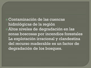 La región analizada tiene problemas agrícolas debido a que depende de la temporada de lluvias. Presenta bajos rendimientos por hectárea en cultivos básicos y poca tierra plana apta para maquinaria agrícola. También sufre contaminación de cuencas hidrológicas, degradación de bosques por incendios, y pérdida de vegetación. Sus tierras son propensas a la erosión por viento y agua. El principal problema ambiental es la contaminación de cuerpos de agua por descargas sin tratamiento. La cacería