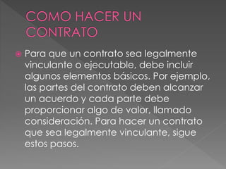 Para que un contrato sea legalmente vinculante, debe haber una oferta y aceptación entre las partes, así como una consideración, que es algo de valor que cada parte proporciona. Un contrato válido requiere que la oferta sea aceptada por la otra parte mediante acción oral o escrita. Redactar el contrato por escrito ayuda a documentar los términos del acuerdo y las obligaciones de cada parte.