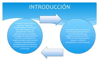 El documento presenta el plan de marketing de la empresa Calzado Gamo's para lograr un mayor crecimiento en el mercado nacional en 2014. La empresa busca posicionar mejor su marca con asesoría de expertos en marketing. Se analizan aspectos del mercado, productos, clientes objetivo, y se presenta una matriz FODA y una matriz de ventaja competitiva para definir estrategias.
