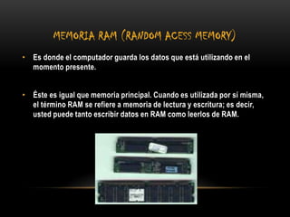 Este documento describe los diferentes tipos de memoria RAM, incluyendo DRAM y SRAM. Explica las ventajas y desventajas de la memoria RAM y proporciona detalles sobre las especificaciones y velocidades de las memorias DDR, DDR2 y DDR3. Finalmente, concluye que la memoria RAM continuará mejorando en velocidad, capacidad y tamaño a medida que la tecnología progrese.