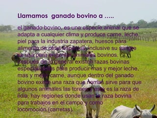 El documento describe diferentes razas bovinas de Colombia. Menciona que el ganado bovino se adapta a cualquier clima y produce carne, leche, piel y otros subproductos. Luego describe 10 razas criollas colombianas y 2 razas sintéticas, incluyendo su origen, características, población y zonas de influencia.