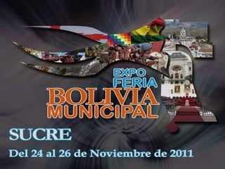 Este documento invita a la Expoferia Bolivia Municipal 2021, un evento anual que se llevará a cabo del 24 al 26 de noviembre en Chuquisaca, Bolivia. El evento reunirá a los 337 municipios de Bolivia para que presenten sus logros en gestión, desarrollo y promoción de la industria local. La Expoferia incluirá stands municipales, conferencias, intercambio de experiencias y eventos culturales con el fin de fomentar la productividad y el desarrollo entre los municipios bolivianos.