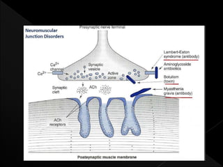 1. El documento describe varios trastornos neuromusculares como la miastenia gravis, el síndrome de Eaton-Lambert y el botulismo.
