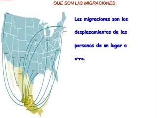 Este documento describe los tipos principales de migración humana, incluyendo las causas, consecuencias y tipos. Las migraciones son los desplazamientos de personas de un lugar a otro y pueden ser internas o externas. Las causas incluyen factores económicos, desastres naturales, guerras y persecuciones. Las consecuencias pueden ser desequilibrios demográficos y sociales entre las regiones. Las migraciones internas incluyen el éxodo rural del campo a la ciudad, mientras que las externas implican el movimiento entre países