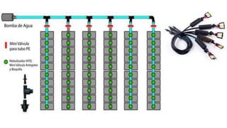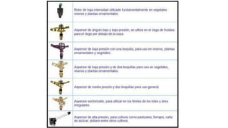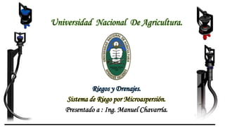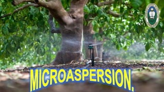 El documento describe el sistema de riego por microaspersión. Explica que este sistema distribuye agua en forma de lluvia fina a través de microaspersores que cubren un área reducida de manera uniforme. El documento también detalla los componentes clave del sistema como válvulas, tuberías, filtros y microaspersores, y explica que este método permite aplicar fertilizantes de manera eficiente.