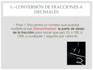 Este documento presenta los pasos para convertir entre fracciones y decimales. Explica cómo convertir fracciones como 3/4, 3/16 y 1/3 a decimales, y decimales como 0.75 y 0.333 a fracciones. También cubre cómo comparar fracciones usando los métodos decimal o del mismo denominador, el cual involucra encontrar el mínimo común múltiplo de los denominadores.
