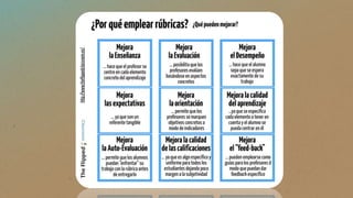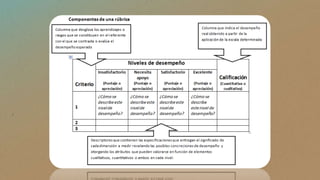Una rúbrica es una herramienta de evaluación que utiliza criterios y estándares relacionados con objetivos de aprendizaje para medir el desempeño o calidad de una tarea. Proporciona una escala de niveles de desempeño y características específicas para cada nivel, haciendo la calificación más objetiva, simple y transparente.