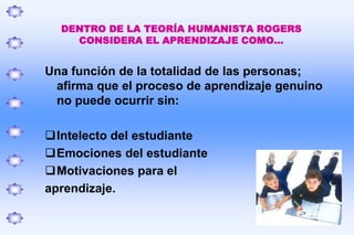 El documento presenta los fundamentos de la teoría del aprendizaje humanista. Describe las contribuciones de pensadores como Maslow, Rogers y Murray, quienes se enfocaron en las necesidades y capacidades humanas. Propusieron que el aprendizaje debe considerar factores como las emociones, motivaciones y desarrollo personal del estudiante. También se mencionan enfoques como el aprendizaje cooperativo, el cual promueve que los estudiantes aprendan trabajando en grupo.