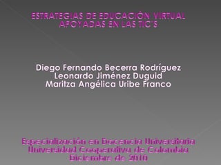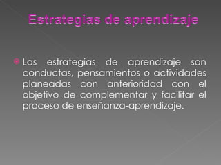 Las estrategias de aprendizaje se clasifican en asociativas, de elaboración y de organización dependiendo de su complejidad cognitiva. La metacognición es importante para generar un plan estratégico y es una condición para el aprendizaje. El aprendizaje con nuevas tecnologías requiere que los estudiantes tengan autonomía e independencia para administrar su tiempo y diseñar su método de estudio.