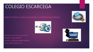 Este documento resume los principales aspectos éticos y legales asociados con la información digital, incluyendo los derechos de autor y las dimensiones morales como los derechos y obligaciones de la información, derechos de propiedad, responsabilidad y control, y calidad de vida. Explica que los derechos de autor protegen los derechos morales y patrimoniales de los creadores de obras literarias, artísticas y científicas, y que los titulares de derechos de autor tienen derecho a reproducir, distribuir y transmitir públicamente