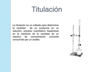 El documento presenta información sobre diferentes tipos de titulación química como titulación ácido-base, redox, por precipitación, formación de complejos y sin indicadores. También describe conceptos clave de la volumetría como punto de equivalencia, normalización, estandarización, curvas de neutralización y cálculos de reacciones químicas. Finalmente incluye una bibliografía de referencias sobre estos temas.