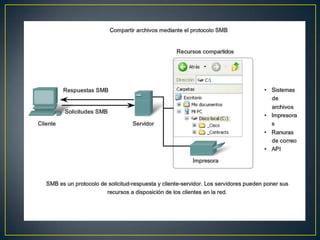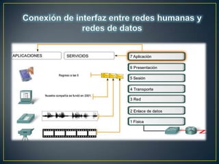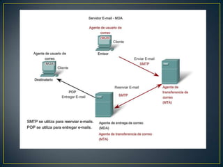 Este documento describe los pasos del modelo OSI y los protocolos y servicios de las capas de red y aplicación. Explica la creación, segmentación, transporte, reensamblaje y entrega de datos a través de una red, así como protocolos como TCP/IP, SMTP, POP, SMB y Telnet y cómo permiten la comunicación y el intercambio de información entre aplicaciones y servicios de red.