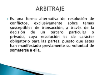 El documento discute la importancia de la autonomía de la voluntad en el arbitraje de derecho internacional privado. Explica que el arbitraje se basa en la voluntad de las partes de someterse a una decisión obligatoria de un tercero privado. También destaca que la autonomía de la voluntad es fundamental para el arbitraje y permite a las partes elegir esta vía de resolución de conflictos y acordar los términos del arbitraje.