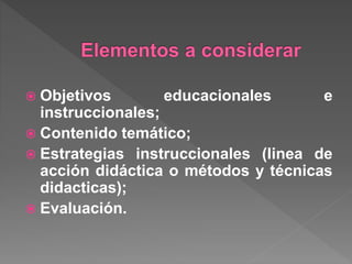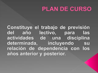 El documento proporciona instrucciones para desarrollar un plan de estudios. Indica que el plan debe incluir objetivos educativos, contenido temático, estrategias de enseñanza, y evaluación. También debe considerar horas disponibles, programas mínimos, condiciones del contexto escolar, y materiales de enseñanza. El plan debe asignar un número de clases a cada unidad temática y describir la extensión y profundidad de cada unidad.