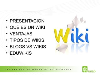 Un wiki es un sitio web colaborativo que permite a los usuarios crear, editar y modificar contenido de forma rápida e interactiva. Los wikis tienen ventajas como mantener un historial de cambios y permitir ediciones inmediatas. Existen wikis privados, protegidos y públicos. Los wikis se diferencian de los blogs en que promueven la colaboración y revisión del contenido. Los eduwikis permiten a estudiantes y profesores editar contenido educativo de forma colaborativa.