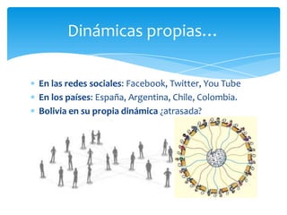 Este documento discute el periodismo líquido y la curaduría de contenidos en las redes sociales. Explica que el periodismo ya no consiste en productos terminados sino en contenidos organizados en torno a temas que cambian con el tiempo y son creados colectivamente. También describe cómo herramientas como Storify y Scoop.it permiten la curaduría de contenidos para darle sentido a la información. Finalmente, argumenta que si bien Bolivia tiene su propia dinámica, los periodistas deben examinar estas tendencias globales y abrazar los camb