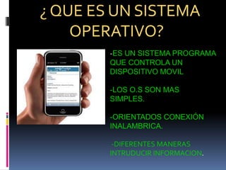 Este documento resume los principales sistemas operativos para dispositivos móviles, incluyendo iOS de Apple, Android, BlackBerry y Windows Phone. Explica brevemente las características, ventajas e inconvenientes de cada sistema operativo, así como los dispositivos compatibles y las tiendas de aplicaciones disponibles. Concluye que Android es el sistema de mayor crecimiento y que ha superado a iOS, mientras que los otros sistemas tienen cuotas de mercado más pequeñas.