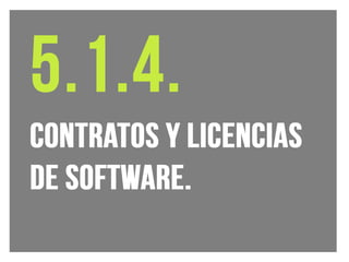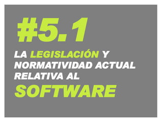 El documento describe la legislación y normatividad actual relativa al software en México. Brevemente resume que la ley federal de derecho de autor protege los programas informáticos a través de certificados otorgados por el INDA. También define piratería y falsificación de software y establece sanciones en el código penal federal para quienes accedan o modifiquen sistemas de información de manera no autorizada.