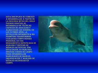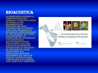 La bioacústica estudia la comunicación animal a través del sonido, analizando cómo el hábitat y las reglas de difusión del sonido moldean las señales de los organismos. Esta disciplina se desarrolló a partir de la segunda mitad del siglo XX con el avance de técnicas de análisis de sonido, y ahora la computación permite transformar cualquier computadora en una herramienta sofisticada para estudiar señales acústicas.