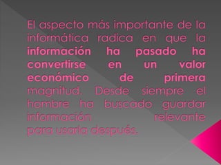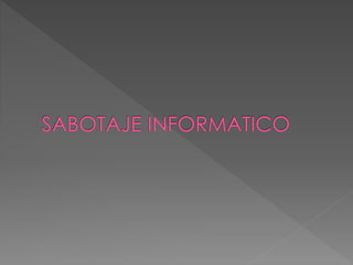 El documento describe varios tipos de delitos informáticos, incluyendo fraude, robo de datos, espionaje, sabotaje y asesinato. Explica técnicas como la introducción de datos falsos, la manipulación de programas, la técnica del salami, las falsificaciones informáticas, el phishing, las bombas lógicas, el ciberterrorismo y las fugas de datos.