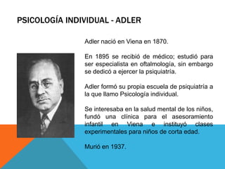 Adler desarrolló la psicología individual, enfocada en la inferioridad, la compensación y la lucha por la superioridad. Propuso que los estilos de vida se establecen temprano y conducen ya sea a desarrollos normales o anormales. La anormalidad surge de sentimientos exagerados de inferioridad y metas irreales, mientras que las personas normales buscan la perfección a través de metas realistas y el interés social.