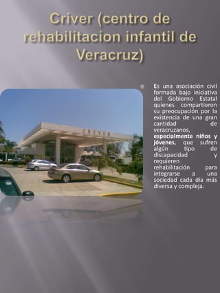El documento presenta un reporte del Centro de Rehabilitación e Integración Veracruzano (CRIVER). CRIVER es una asociación civil formada por el gobierno estatal para brindar servicios de rehabilitación a personas con discapacidad en Veracruz. El reporte describe los servicios y especialidades médicas ofrecidas por CRIVER, así como las instalaciones y equipos disponibles para tratamientos de fisioterapia, hidroterapia y terapias ocupacionales y del lenguaje.